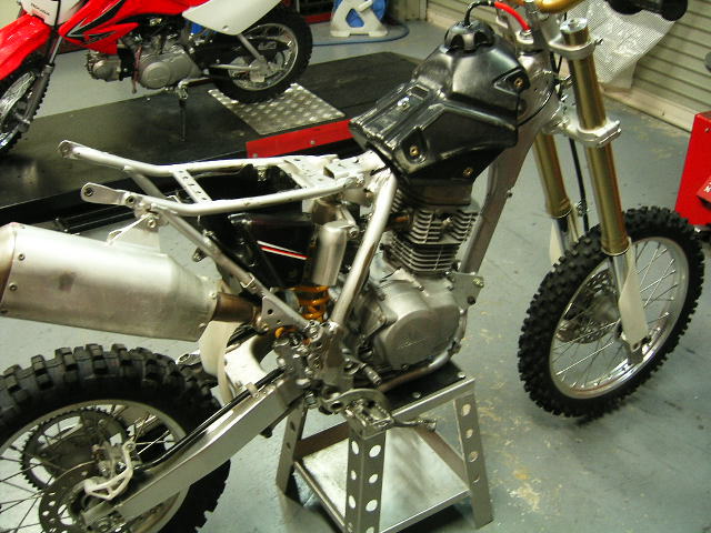 当初はCRF150RのフレームにXR100エンジンをボルトオンで搭載できるキット販売をしようと計画していましたが、やはりどうしても量産が難しい部分がでてきまして販売は断念しました。