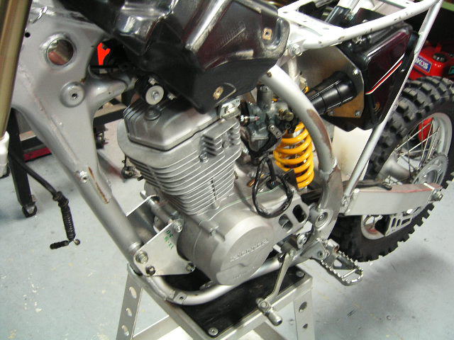 タンクとのクリアランスがやはり背の高いXR100エンジンでは苦しいところ。 |