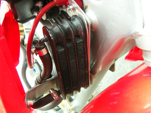 | 排気量アップすると発熱量も増えるし、数戦走行したあとのエンジンオイルの劣化があまりにも激しかったのでオイルクーラーを装着。 |