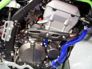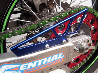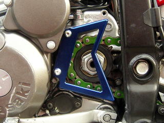 | ドライブスプロケットガードや、ヒールガードもスピードテック製でまとめています。レッドのスプロケットはAFAM製の特注品です。EK製のグリーンチェーンも、カワサキファンなら絶対ほしいアイテムですね。 |
