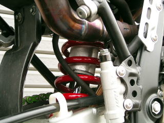 | エキパイのヒートガードはZカーボン製のヒートガードです。ラジエターホースはSFS製シリコンラジエターホースをチョイス!装着後数年経ちますが色あせは、ほとんどありません。リヤサスもスピードテック製ハードスプリングですが、これもオーナーが塗装でレッドに塗り替えています。さすがプロの板金屋さんだけあって色が剥げたりしませんね。 |