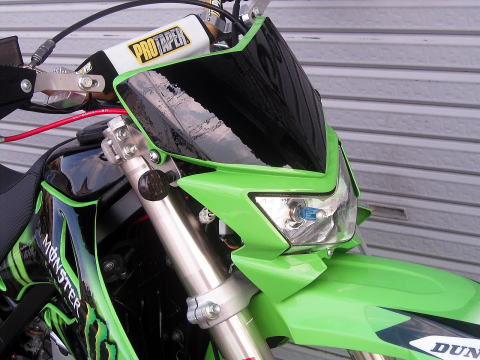 | スピードテックのKLX450Rライトキットは、この車輌から生まれたの商品なのです。このカウルはオーナーが自社で塗装してきた一品物です。カッコイイでしょ!ハンドルは、お気に入りのプロテーパーバーにホワイトのバーパットがこだわりです。 |
