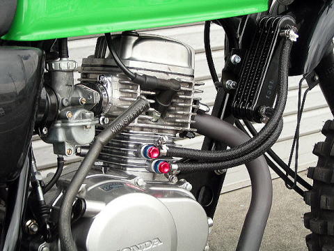 タケガワ製ボアアップキットを50CCでは不足気味のパワーを補う。キャブレターには定番のケイヒンPC20を装着。排気量アップに伴う熱量増大対策にはキタコのブラックオイルクーラーでオールド感を盛り立てる。 |
