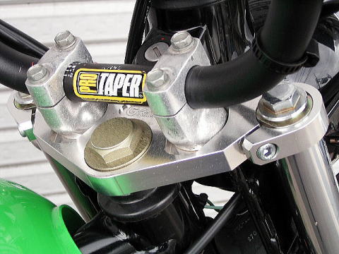 | ハンドルクランプは剛性をアップしたいためにギルド製クランプを使用。本当はブラックアルマイトで仕上げたいところ。ハンドルは高剛性のプロテーパー |