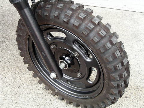 | チューブレスホイールなのにチューブを挿入してMX用タイヤを装着する。 |
