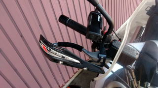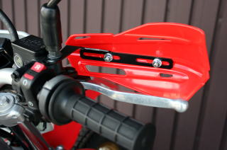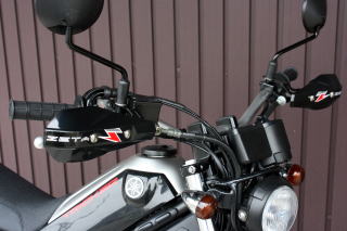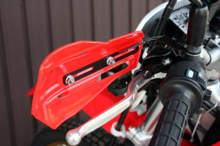 | 市販トレールオフロードバイクはウインカースイッチやセル&キルスイッチや、各ワイヤー類などが複雑に入り組んでいてモトクロッサー用のハンドガードが、非常に取り付け難くほとんどの場合がスムーズには取付出来ません。ハンドルもフラットな部分の長さも少ないのも取付の難ポイントとなっています。そこでミラー穴からステーを取出して市販のハンドガードをセットできるステーセットを開発致しました。取付は非常に簡単で、バックミラーにセットするだけでOKです。厚みのあるスチールプレートを使用していますので強度にも優れMXハンドガードによくある走行風でのバタつきも軽減いたします。汎用パーツですので、各メーカーの車輌に装着可能です(一部車輌は取付に加工が必要な場合がございます)。 Made in Japan |