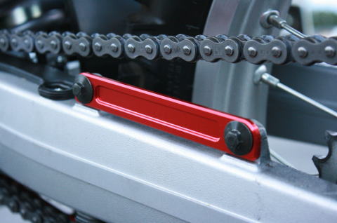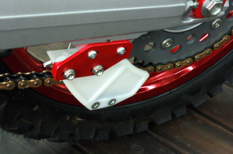 | カワサキKLX125用のチェーンガイドです。オフロード走行をする場合にチェーンが外れる事を防止してくれる後付けタイプのチェーンガイドです。軽量なアルミ製のアタッチメントにてスイングアームを包み込むように取付できます。ガイド部は市販モトクロッサーのチェーンガイドを使用していますので、チェーンガイドのみの補修部品も販売できますので長期の使用にも安心してご使用できます。 Made in Japan |