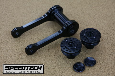 フロント部は、フォークキャップの交換のみで車高を変化させることが出来ます。ダンパーロッドの取付け位置を変化させることでフォークの全長を変化させています。リヤ部はリンクロッドの長さを変化させるこでスイングアーム角度を変化させて車高を変化させています。しかも使用の材質をノーマルのスチール(鉄)から、レーサーにも使用されていますアルミ材に変更しており非常に軽量に仕上がっております。ニードルベアリングやオイルシール(ホンダ純正部品)も、組込み済みです。