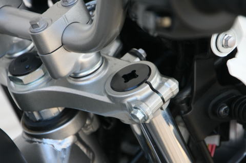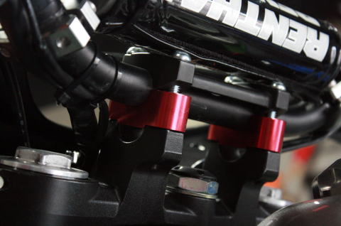 CRF250Lにスパイラル製ハイシート(座面30mmアップ仕様)を装着すると、シート高が上がるために、ハンドルの高さが低く感じます。このクランプキットを装着することでハンドルの高さを適正に修正することが出来ます。ワイヤー類の交換も必要なくボルトオンで装着出来ます。 |