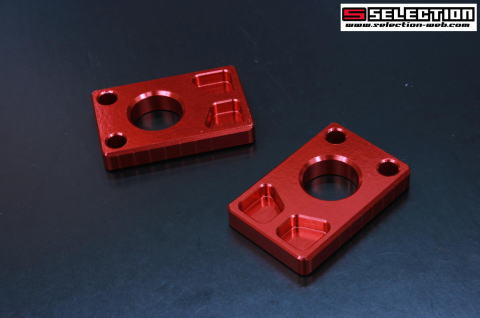 | 定番アイテムのアクスルブロックですが、当社は他社と同じことはしません。全く逆の発想で「大きく」製作いたしました。小型&軽量化が普通のチェーンブロックの考え方ですが、当社は剛性と、ファッションアピールアイテムとして、あえて大きく設計いたしました。肉抜き加工もポケット加工と貫通の2パターンを使って、小さい部品ながら最大限のアピールアイテムとして販売いたします。実際車輌に装着しますと非常に目立つアイテムとなります。アピール度は、なかなかのものです。もしスプロケ・チェーンの駒数の関係でチェーンを後方に調整する場合は、チェーンブロックを逆向きにすることでアジャストボルトの出具合を最小限にすることが可能なので、アジャストボルトの破損を最小限に抑えることが出来ます。 Made in Japan |