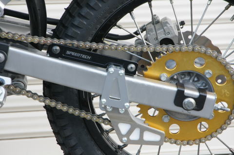 | またニュータイプなアイテムの登場です。今までのヒールガードは、どうしてもオンロードバイク系のデザインの匂いがしていたので個人的に、どうも好きになれませんでした。オフロードバイクでカッコ良い車輌を製作しようと参考にするのはやはりMXレーサーですね。MXレーサーには元々ヒールガードという部品は付いておりません。市販バイクのみ2人乗りの乗車人のチェーンの巻き込み防止のために装着された部品だからです。一般市販車輌をMXレーサー風に仕上げていく時に、このヒールガードが邪魔になってきます。ガード類は簡単に取外し出来ますがスイングアームに取付けられたヒールガードの取付け部は、車輌売却時のことを考慮すると簡単にはカットすることが出来ません。そこで、取付け部分のみカバー出来る最小のプレートを製作しました。これならMXレーサーのテイストを出すことも可能ですし、ガードの取付け部を上手く隠すことも出来る画期的なアイテムです。また、モタードホイール転換時にもホイールとガード類の接触を防げるので非常に便利なプレートです。アルマイトは、レッドとブラックの2色をご用意いたしました。より存在感を消したいなら「ブラック」車輌全体のコーディネイトなら「レッド」アルマイトカラーが、おすすめです。 Made in Japan |