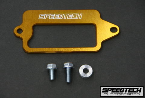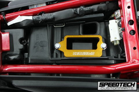 吸入空気量を大幅にアップ出来る画期的なアイテムです。現行の車両は加速騒音対策に吸入音を少なくするため吸入口を小さめに設計されております。当然吸入口面積が小さいと、いっぱい空気が吸えませんので燃料も沢山燃やすことが出来ませんよね。これではパワーアップなど望むことが出来ません。そこでボルトオン部品で間単に吸入口を大きく出来るスペシャルパーツを製作いたしました。エアークリーナーエレメントの蓋を、交換するだけの簡単装着です。これで吸入口が一気に広がります。吸入音も変化しますので、かなり良い吸入音になりますよ。NCマシニングにてアルミ材を削り出し、ゴールドアルマイトにて表面処理いたしました。